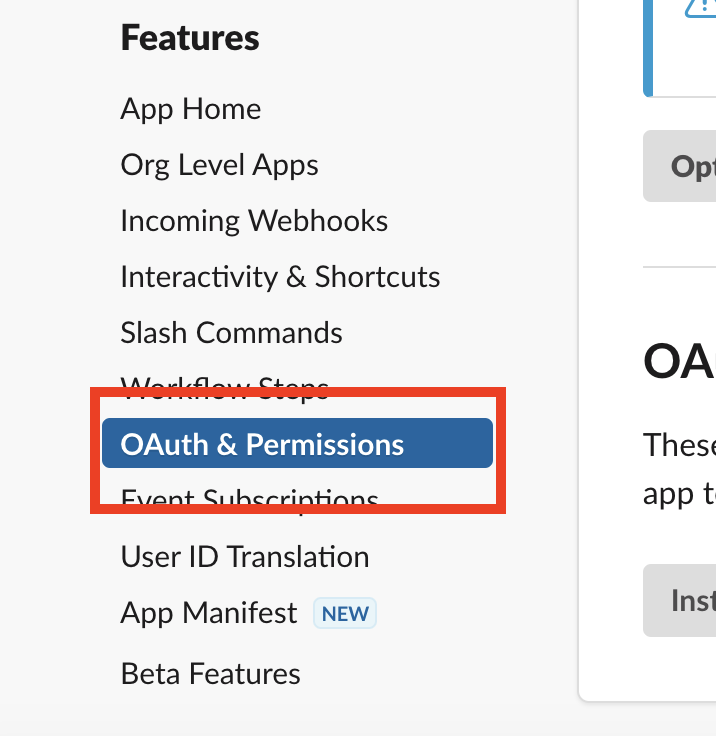 - 좌측 메뉴 중 [OAuth & Permissions] 를 선택합니다.