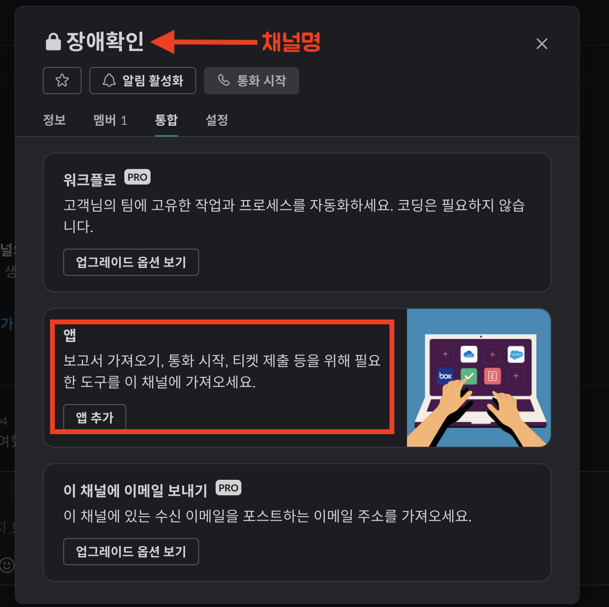 - 채널을 선택 후 채널 설정을 들어가 [통합] -> [앱] -> [앱 추가] 를 클릭하여, 슬랙봇(Slack Bot)을 추가합니다.