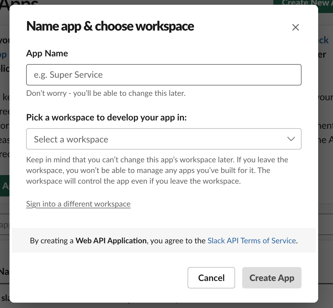 - 사용하고자 하는 앱 이름(App Name)을 작성합니다.(슬랙 채널에서 Bot이 보낼 때의 이름)