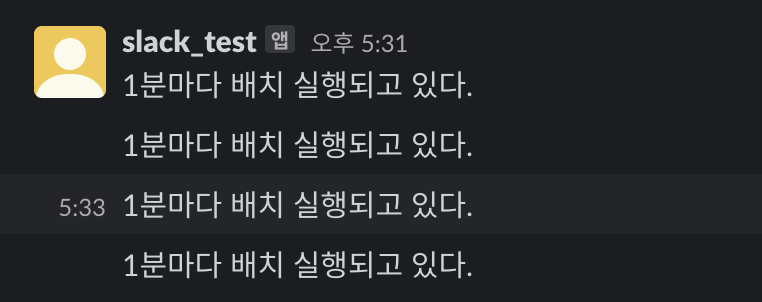 slackService.sendSlackMessage("1분마다 배치 실행되고 있다.", "batch");