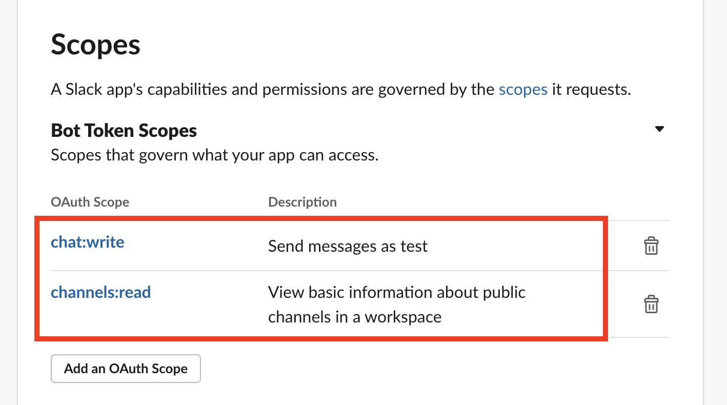 - [Scopes] -> [Bot Token Scopes] 에 다음의 scope 을 추가합니다.