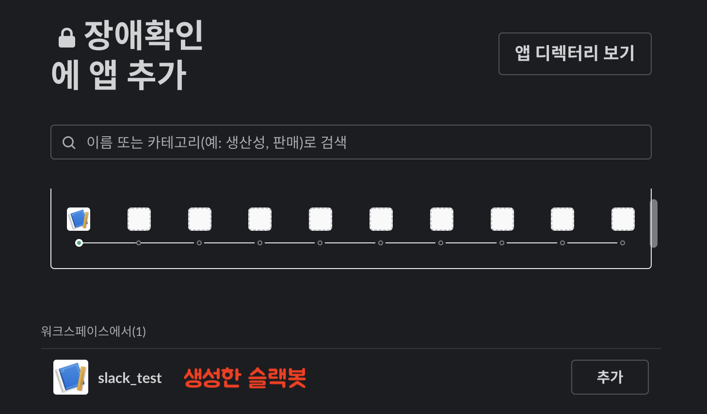 - 생성한 슬랙봇을 연동하고자 하는 채널(Channel)에 추가합니다.