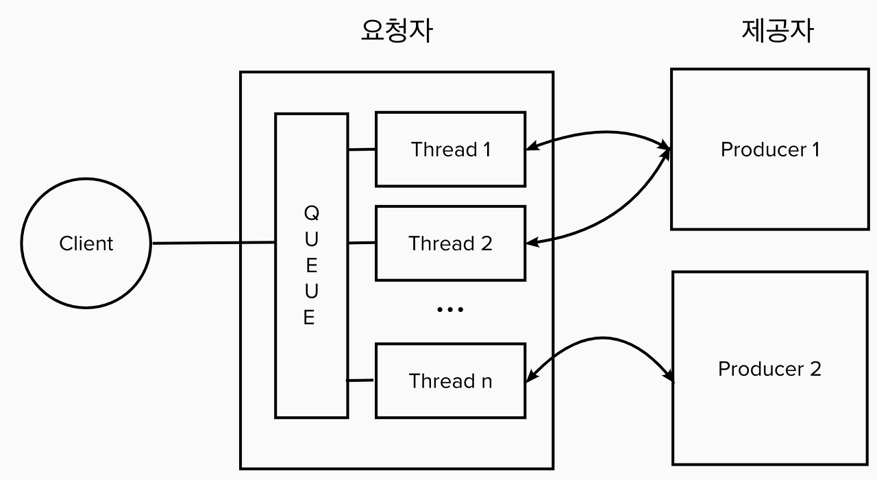 - Request(요청) 는 먼저 Queue 에 쌓아두고, 가용 가능한 쓰레드(Thread)가 있다면 해당 쓰레드에 할당하여 처리한다.