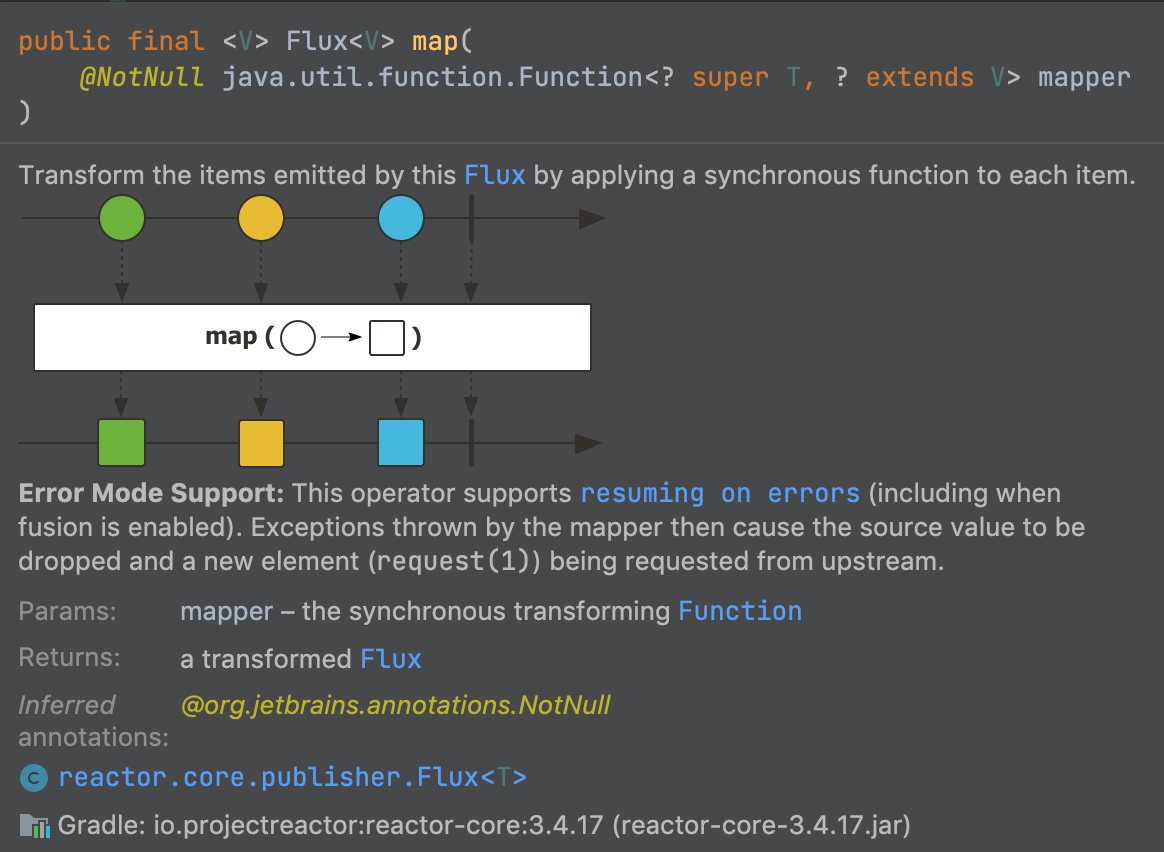- 해당 영역에서 exception 을 Throw 하면 onErrorResume 이 실행되어 최종적으로 Exception 을 처리. - map