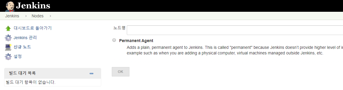 - 노드명을 작성 후 Permanenent Agent 체크 후 OK 클릭
