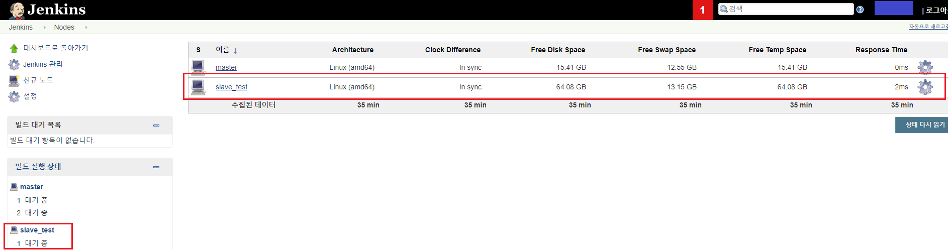 Master 서버는 jenkins가 구동되고 있는 서버이며 Slave 서버는 jenkins가 설치되어 있지 않습니다.(Java JDK는 설치)