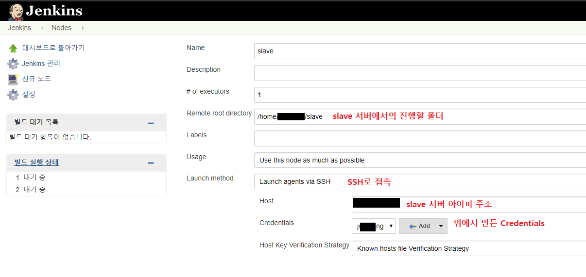 | Remote root directory | Credentials 등록할 때 입력한 username의 기본 폴더 (즉, slave 서버에서 사용할 디렉토리) |