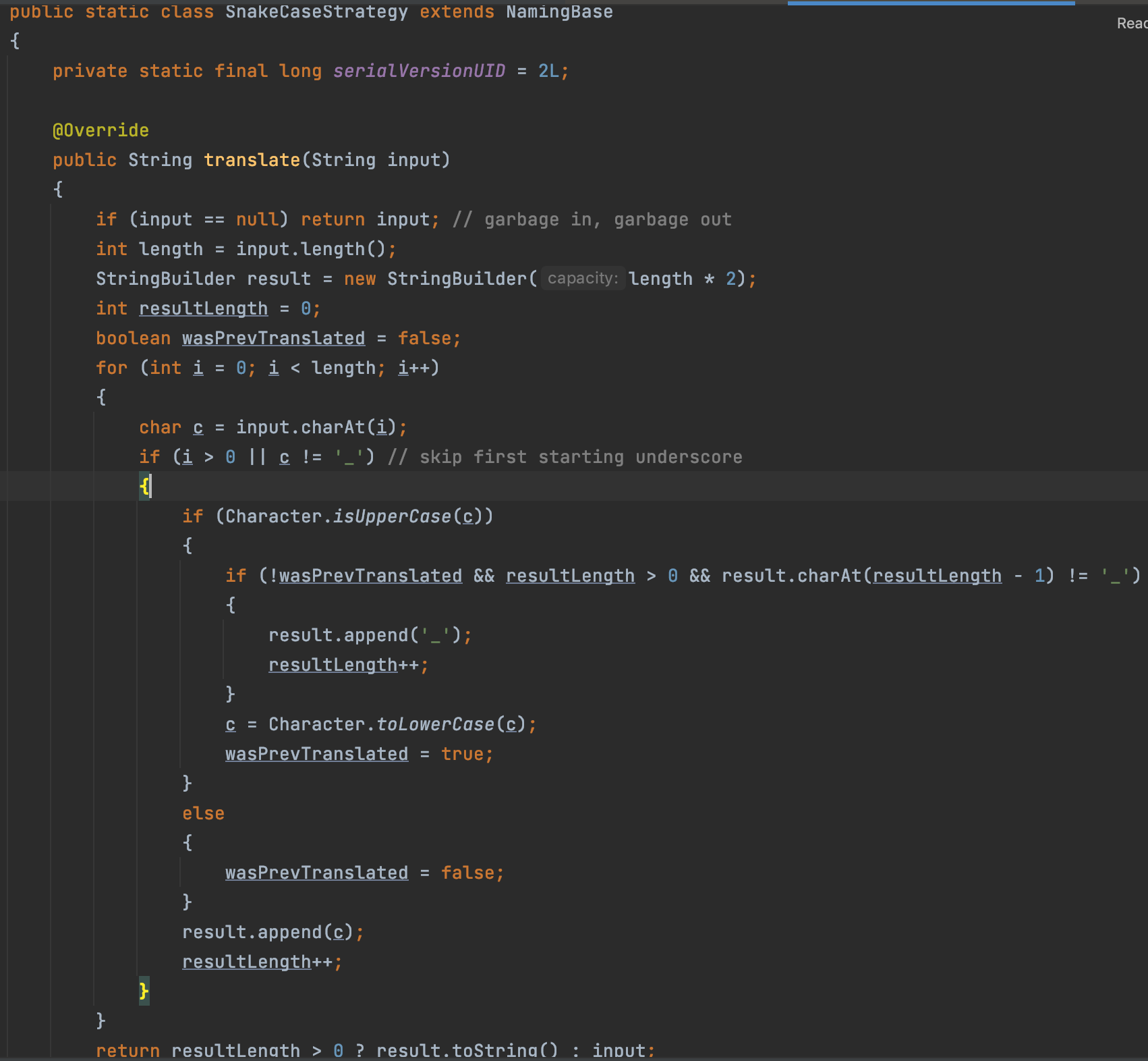 - 아래 이미지는 @JsonNaming 어노테이션에 적용하는 PropertyNamingStrategies.class 아래 SnakeCaseStrategy static 클래스이다.