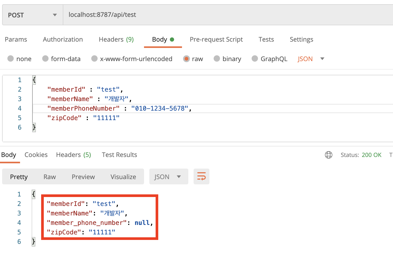 - 이유는 요청한 key 이름(memberPhoneNumber)와 응답 객체(member_phone_number)의 파라미터 명이 다르기 때문에 발생한 문제입니다.