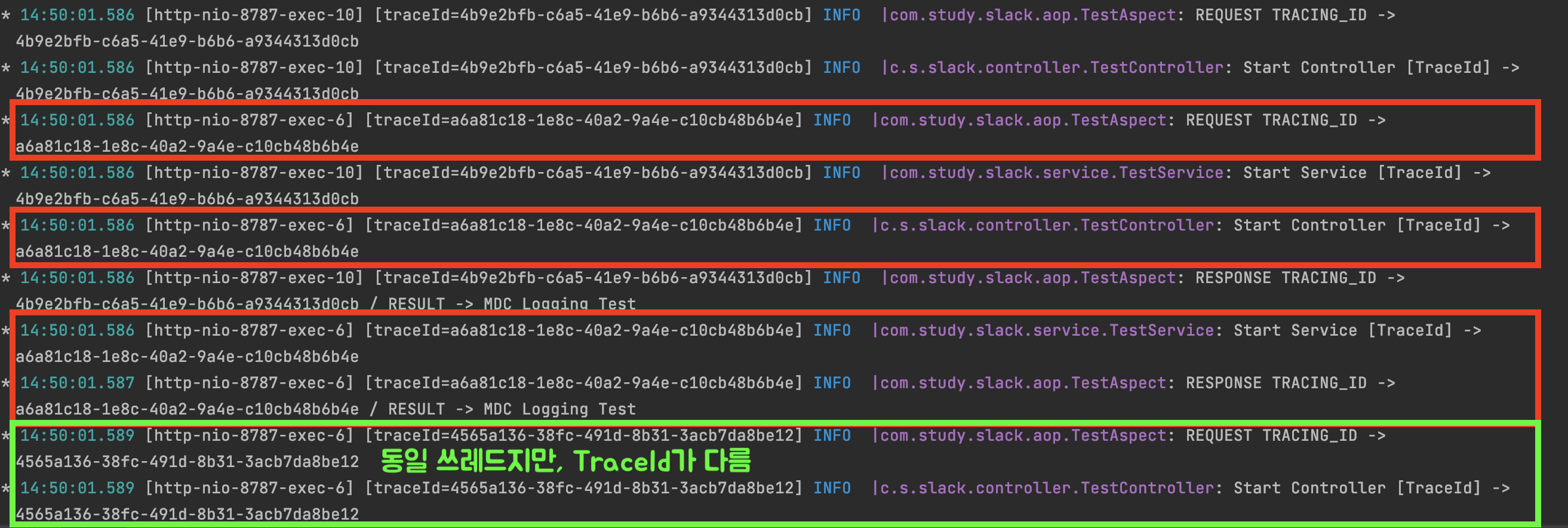- Controller 를 요청하였을 때는, 아래 그림과 같이 동일 쓰레드(http-nio-8787-exec-6)지만, TraceId 가 다른 것을 확인할 수 있고, 이 TraceId로 트래킹을 하면 조금 더 편하게 로그 트래킹을 하실 수 있습니다.