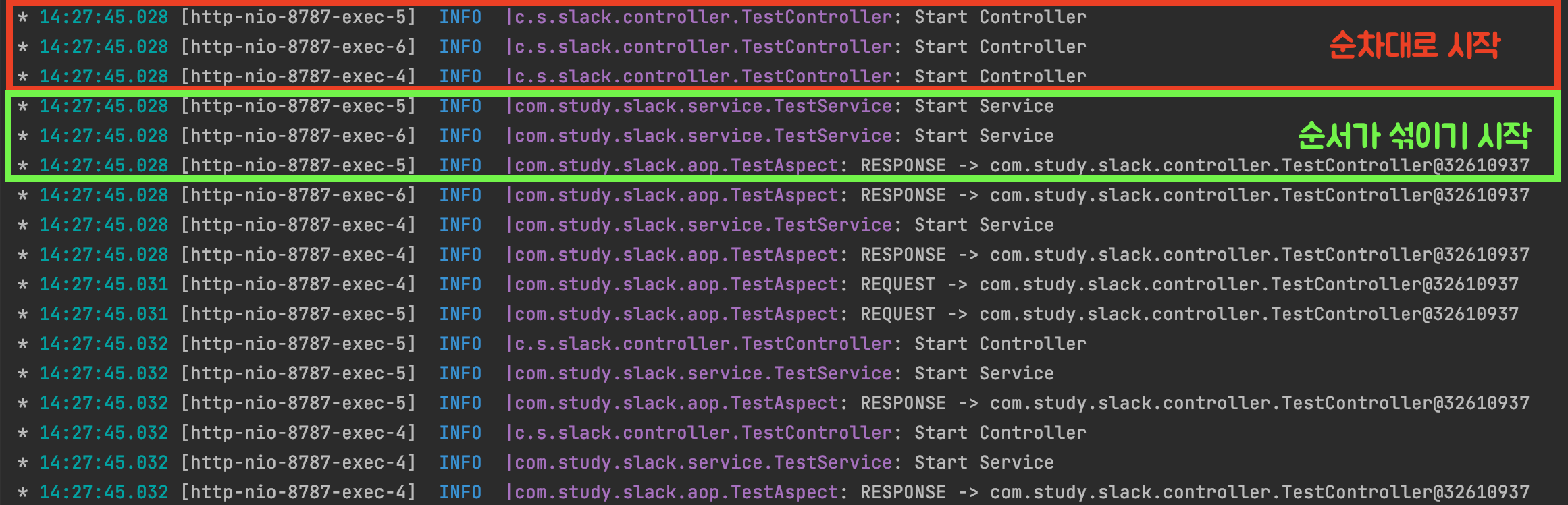 - 실제 운영하는 서비스에서 로그를 확인하다 보면 동시에 요청이 오는데, 이때 로그는 연속적으로 쌓이지 않고, 순서 없이 처리하는 대로 쌓이게 된다.