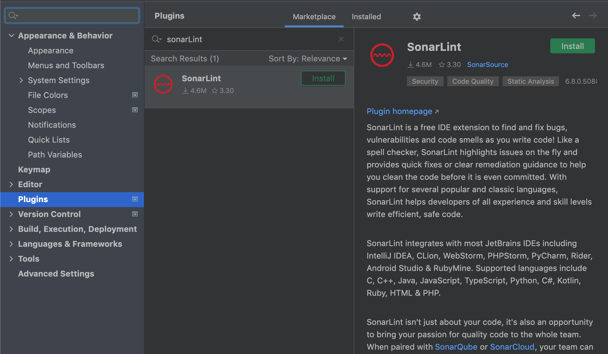 - [Plugins] 에서 sonarLint 검색 및 설치