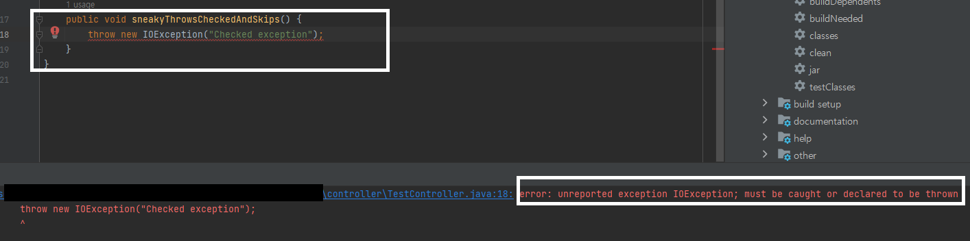 - 위에 선언한 sneakyThrowsCheckedAndSkips 메소드를 다른 메소드에서 호출하고자 한다면 다음과 같이 메시지가 나옵니다.