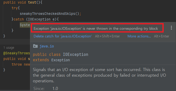 - 즉, sneakyThrowsCheckedAndSkips 메소드가 IOException을 발생시키고 있더라도 컴파일러는 이를 인식하지 못하여, 컴파일에 실패하게 됩니다.
