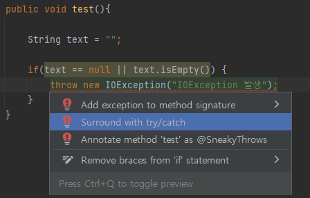 error: unreported exception IOException; must be caught or declared to be thrown throw new IOException("IOException 발생");