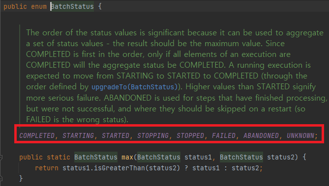 - BatchStatus 는 Job 또는 Step 의 실행 결과를 Spring 에서 기록할 때 사용하는 Enum 입니다.