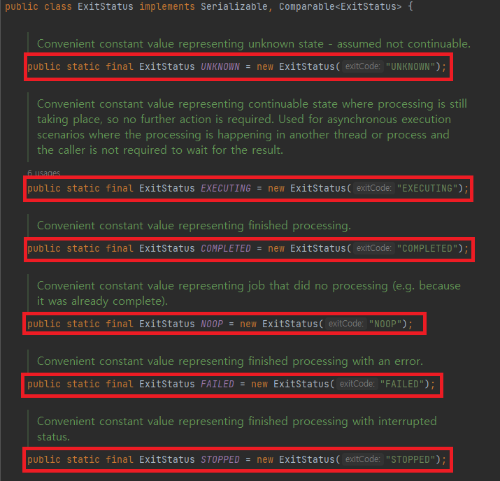 - ExitStatus 는 Step 의 실행 후 상태를 말합니다.