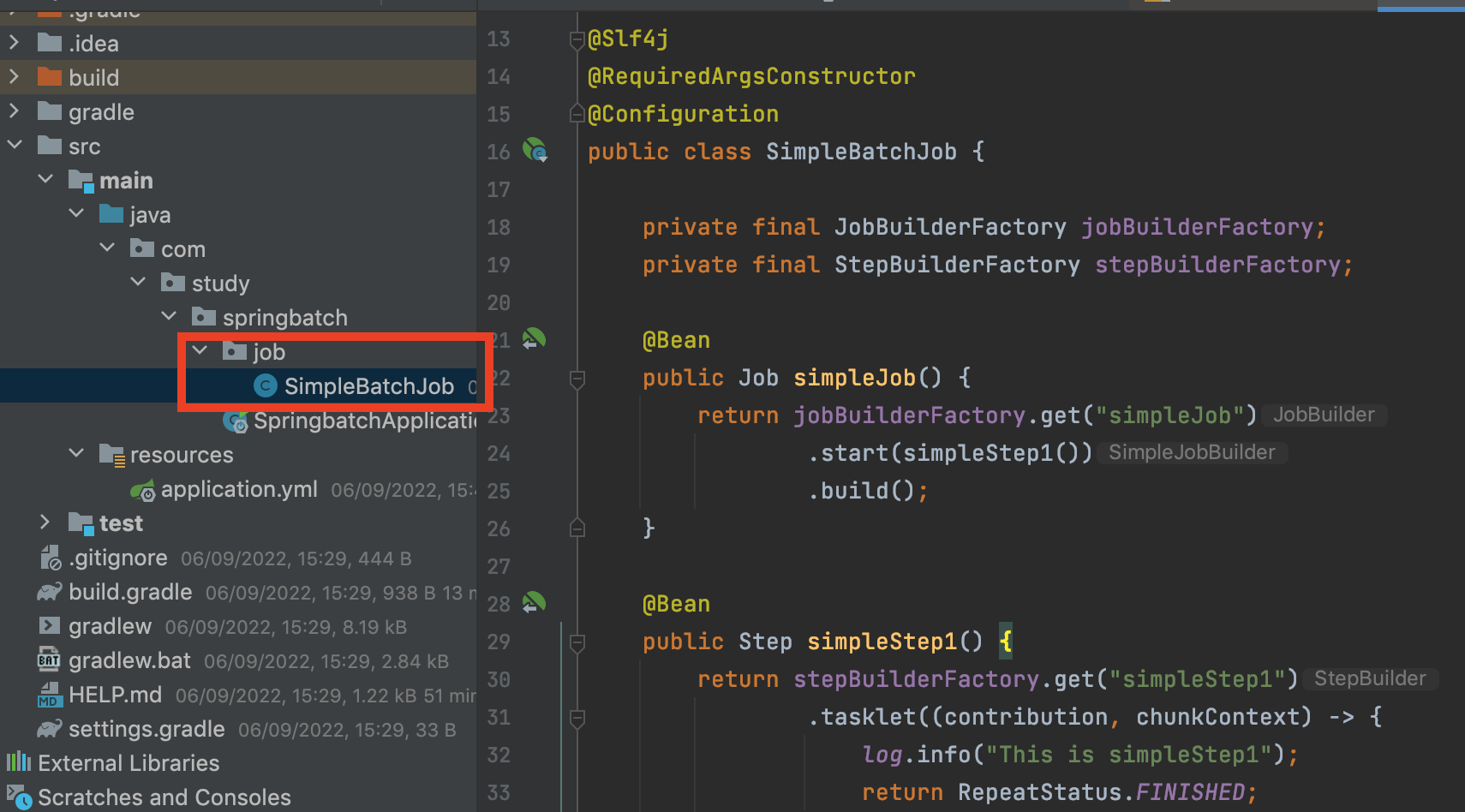 - job의 이름은 별도로 지정하지 않고, 이렇게 Builder 를 통해 지정합니다. - stepBuilderFactory.get("simpleStep1")