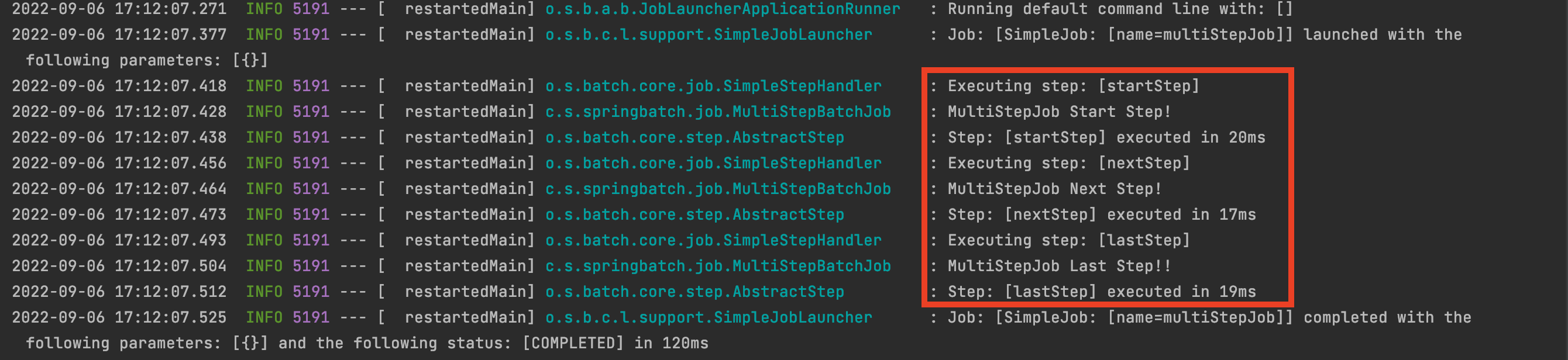 - 해당 Job 을 실행한다면 start -> next -> last 순으로 Step 이 동작합니다.