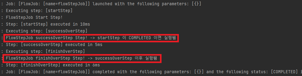 log.info("FlowStepJob successOverStep Step! -> startStep 이 COMPLETED 이면 실행됌");