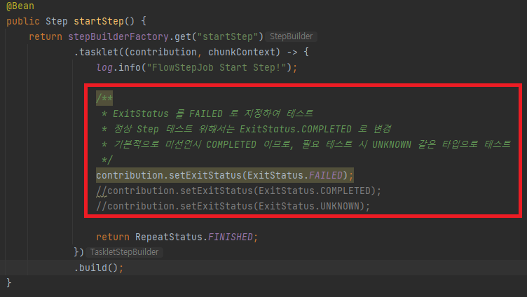* 정상 Step 테스트 위해서는 ExitStatus.COMPLETED 로 변경