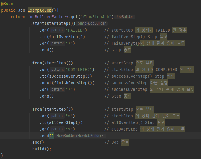 - on("*") 뒤에 있는 end 는 FlowBuilder 를 반환하는 end