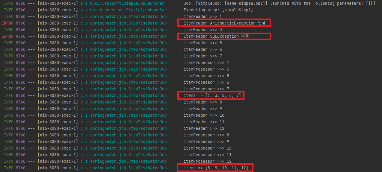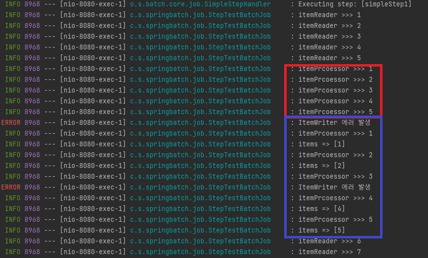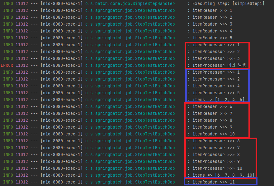 - 그러나, 넘어가더라도 데이터 처리를 위해 재동작을 하게 되는데 이때, ItemReader 는 캐싱된 데이터를 다시 itemProcssor 로 넘기므로 로그는 다시 찍히지 않습니다.