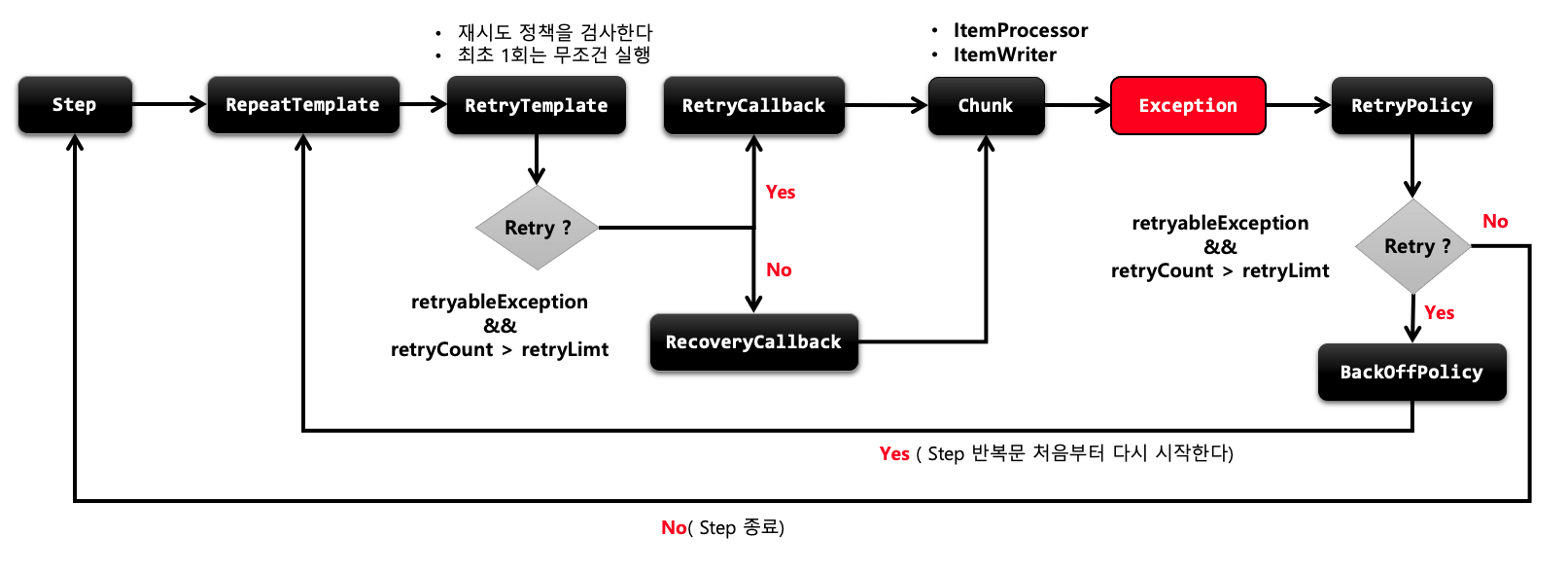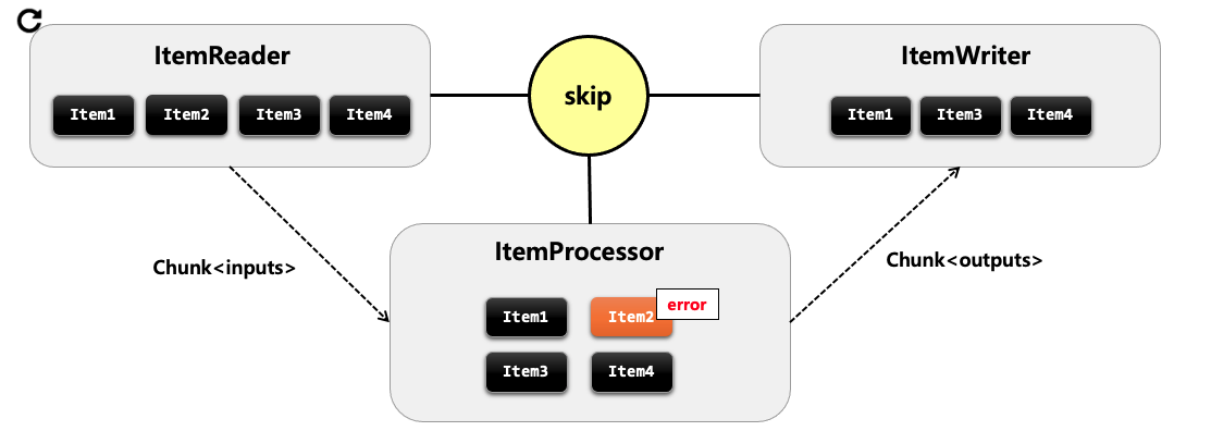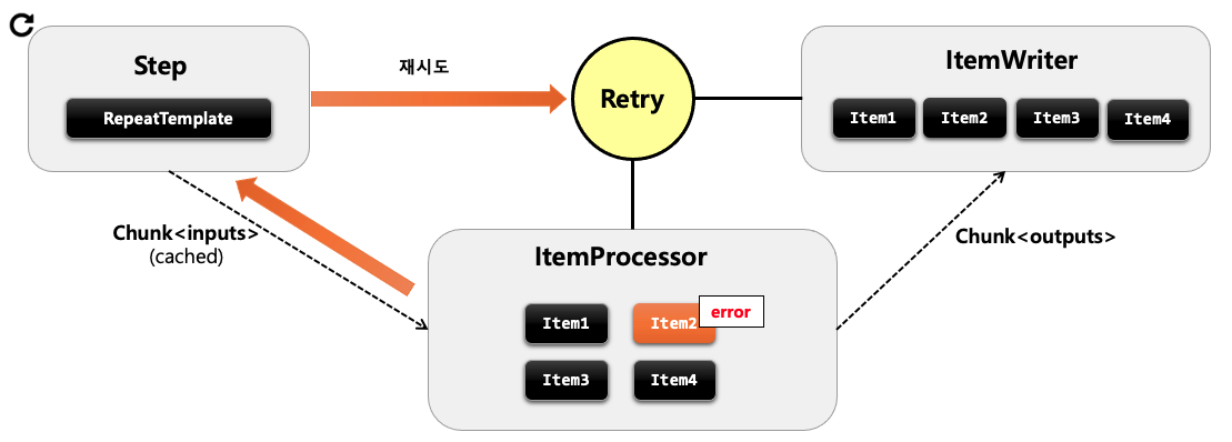 - item 을 처리하던 도중 예외가 발생하면 해당 Chunk 의 첫 단계로 돌아가서 itemReader로부터 다시 데이터를 전달받습니다.
