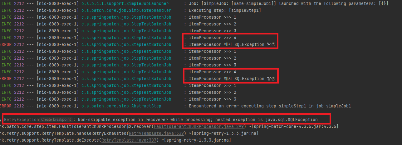 - 4번 째 데이터를 처리할 때 SQLException 이 발생하지만, 해당 Exception 은 Retry 하도록 되어 있으니 재시도하게 됩니다.