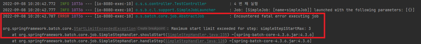 - 만약 startLimit() 에 지정한 횟수보다 더 이후 실행에서는 Exception 이 발생합니다.