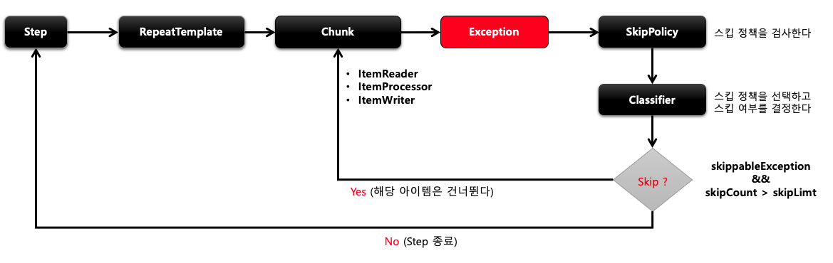 - 데이터의 작은 오류에 대해서 Step 의 실패 처리 대신 Skip 을 함으로써, 배치 수행의 빈번한 실패를 줄일 수 있습니다.