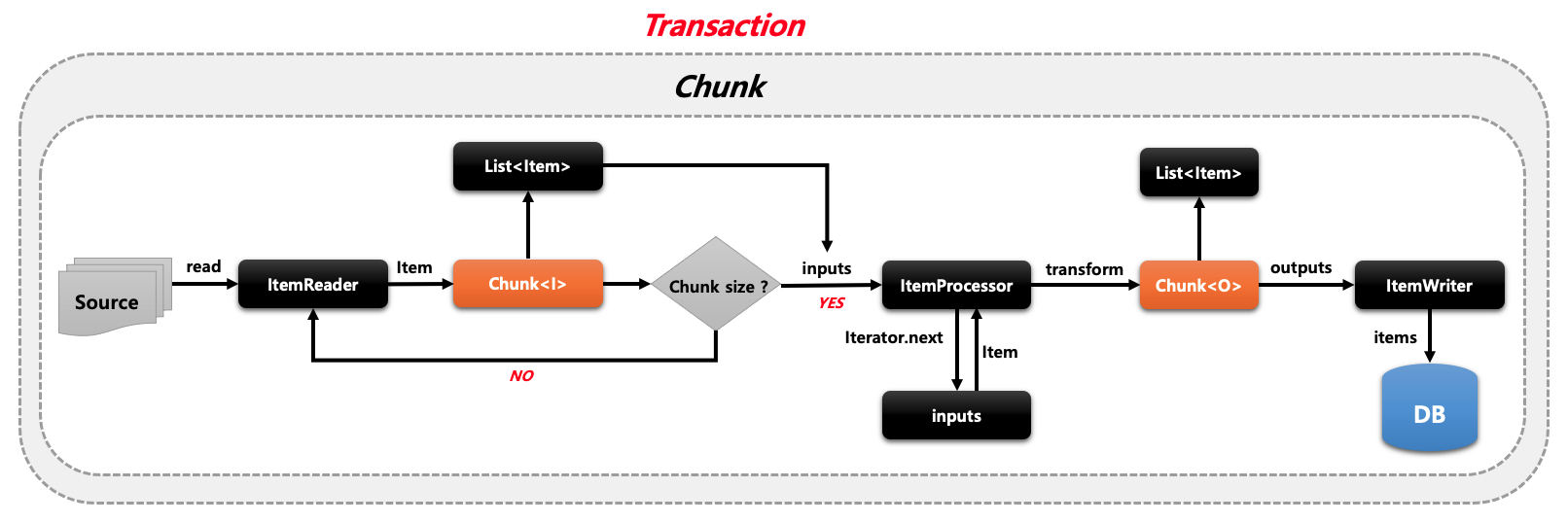 - 한 번에 하나의 아이템을 입력받아 Chunk 단위로 덩어리를 만들어 Chunk 단위로 Transaction(트랜잭션)을 처리.
