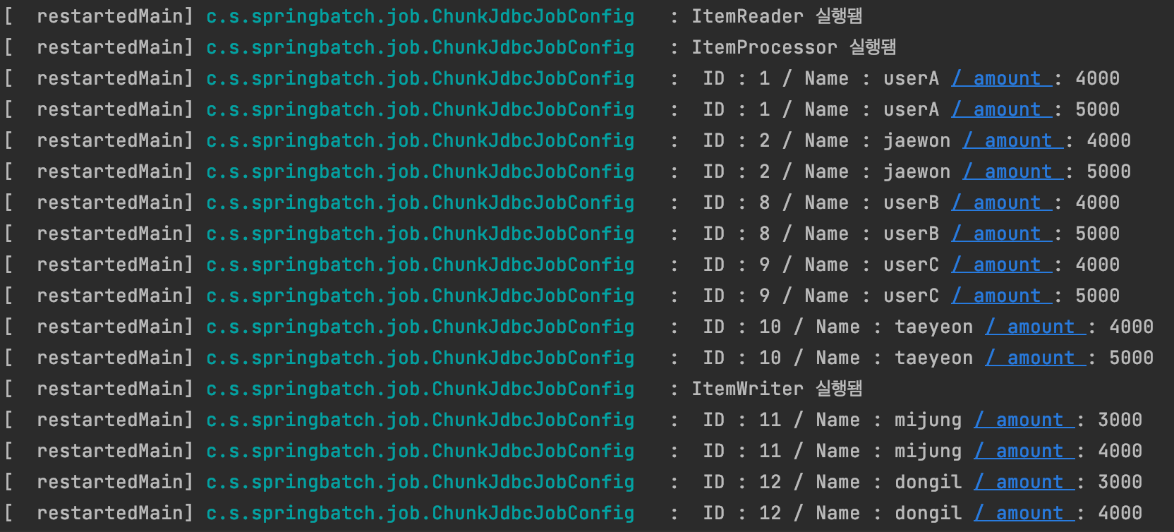 log.info(" ID : " + member.getId() + " / Name : " + member.getName() + " / amount : " + member.getAmount());