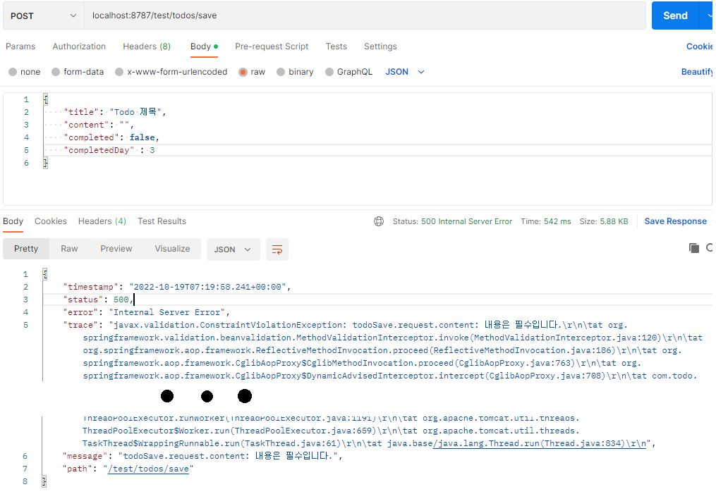 javax.validation.ConstraintViolationException: todoSave.request.content: 내용은 필수입니다. at org.springframework.validation.beanvalidation.MethodValidationInterceptor.invoke(MethodValidationInterceptor.java:120) ~[spring-context-5.3.23.jar:5.3.23] at org.springframework.aop.framework.ReflectiveMethodInvocation.proceed(ReflectiveMethodInvocation.java:186) ~[spring-aop-5.3.23.jar:5.3.23] at org.springframework.aop.framework.CglibAopProxy$CglibMethodInvocation.proceed(CglibAopProxy.java:763) ~[spring-aop-5.3.23.jar:5.3.23] at org.springframework.aop.framework.CglibAopProxy$DynamicAdvisedInterceptor.intercept(CglibAopProxy.java:708) ~[spring-aop-5.3.23.jar:5.3.23] at com.todo.blog.service.TestTodoService$$EnhancerBySpringCGLIB$$9ae86a0a.todoSave(<generated>) ~[main/:na] at com.todo.blog.controller.TestController.createJsonTodo(TestController.java:25) ~[main/:na] at java.base/jdk.internal.reflect.NativeMethodAccessorImpl.invoke0(Native Method) ~[na:na] at