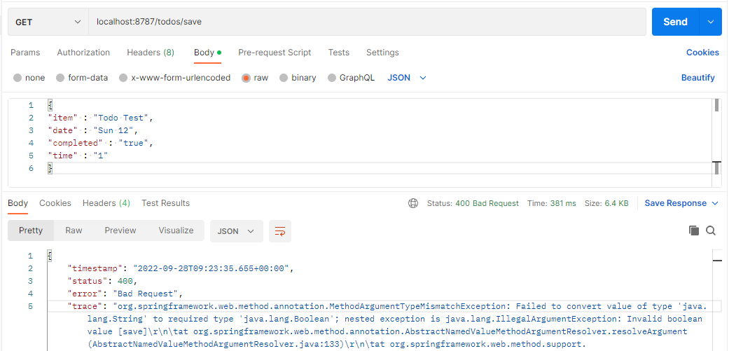 - /todos/save 를 Get 방식으로 호출하면서 orderState 를 Boolean 타입으로 받고 있는데 "save"란 String 단어가 들어가면서 Convert 에 실패를 하게 된 것이다.