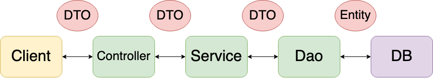 | 목적(역할) | JPA 사용시 DB 와 직접적으로 매핑하여 컬럼의 필드를 가지는 객체 | 계층(Layer) 간 데이터 송/수신 용도의 객체 | 객체안의 값을 통해서 비교해야하는 중요 로직에서 사용하는 Data 객체 |