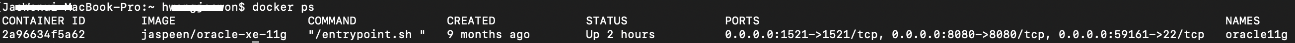- $docker run --name oracle11g -d -p 59161:22 -p 59162:1521 -p 59163:8080 -v ~/my/oracle/data:/ var/lib/oracle -e ORACLE_ALLOW_REMOTE=true --restart=always jaspeen/oracle-xe-11g 를 입력하고 기다려줍니다.