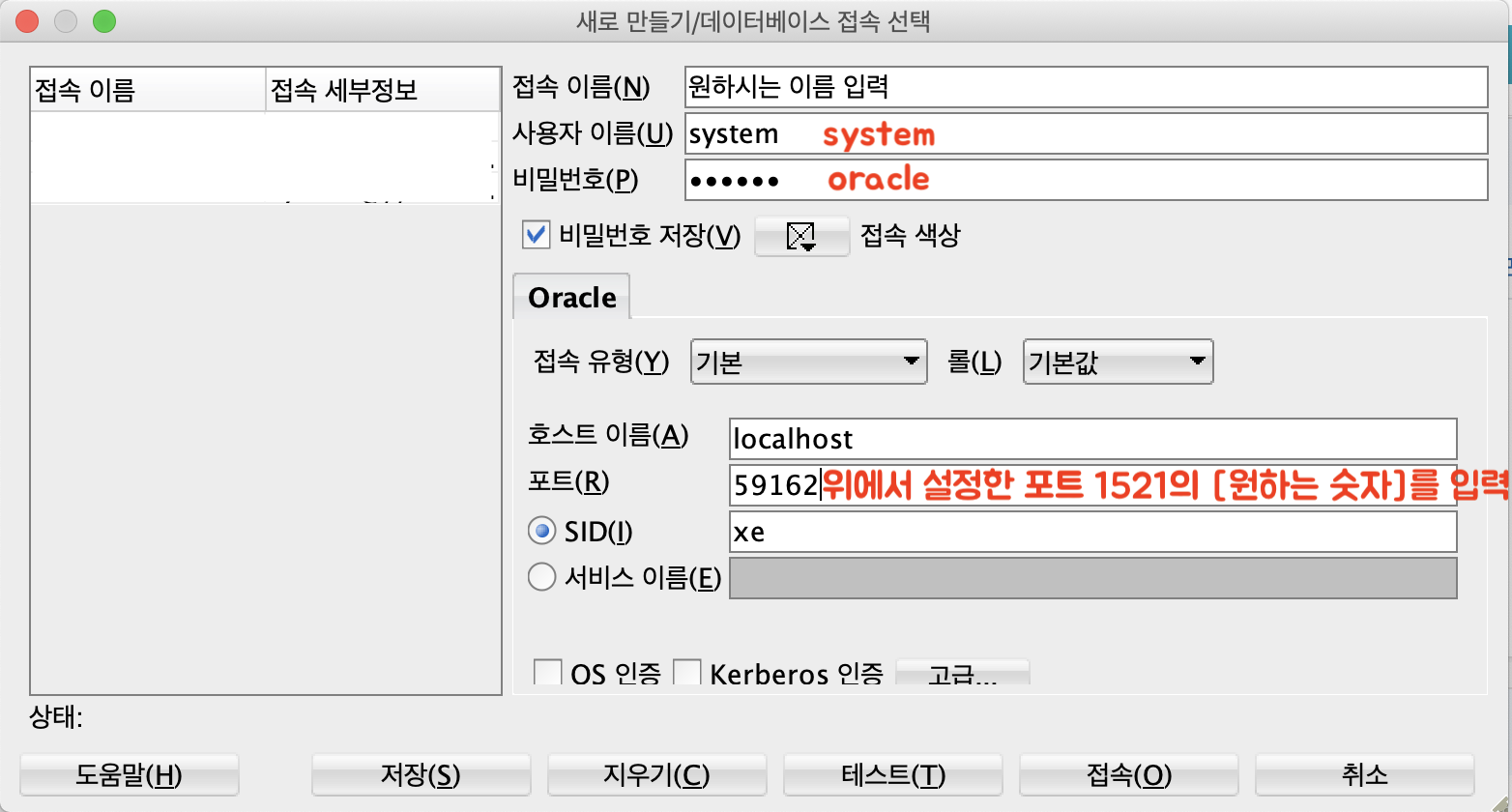 - 포트는 3번에서 설치시 1521의 포트번호에 입력한 숫자를 입력해주세요.(예제에서는 59162 입니다)