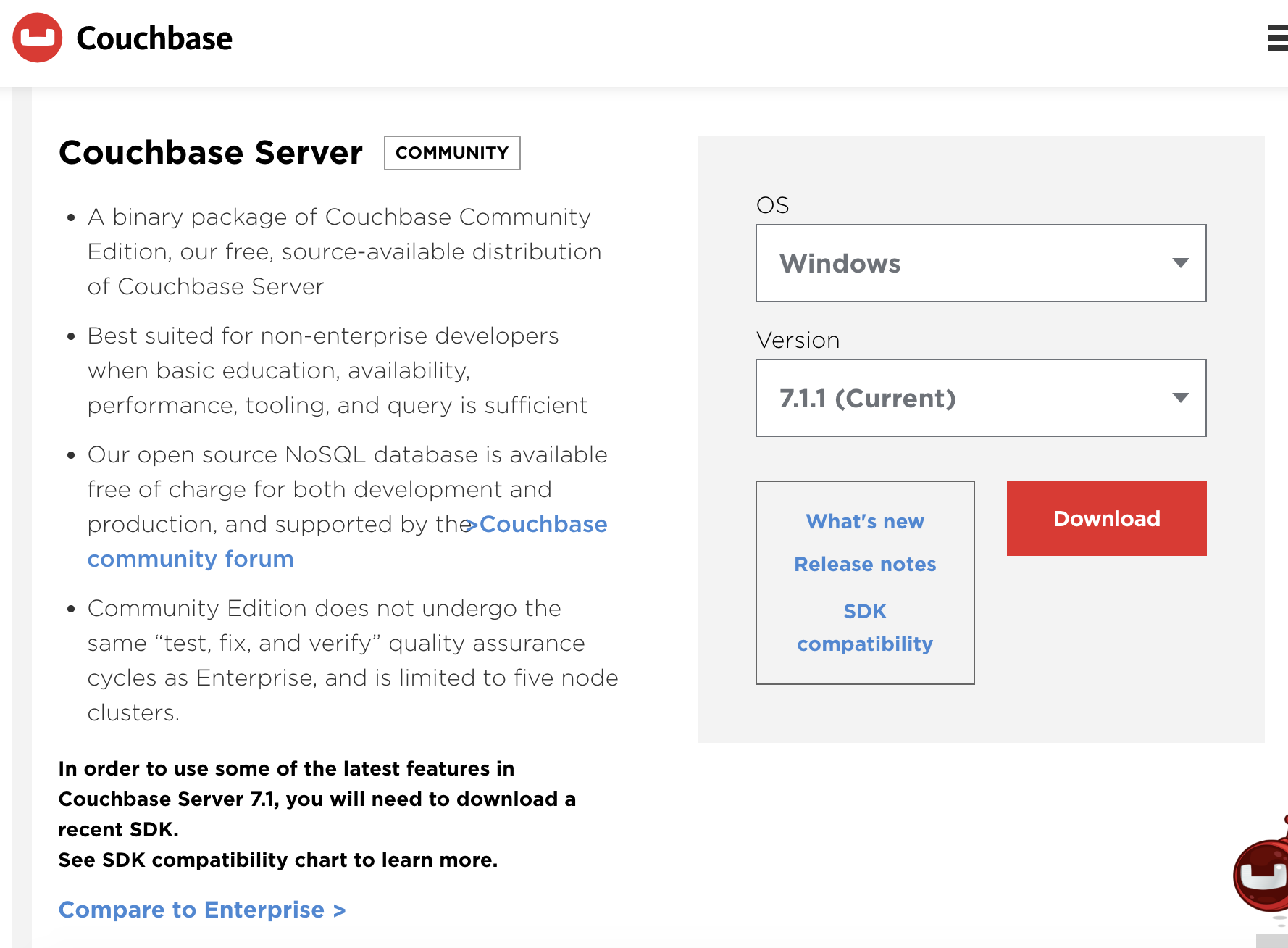 Couchbase Server Enterprise A full-featured, multimodel distributed NoSQL database available free of charge for evaluation, development, and unlimited preproduction testing. Experience the unmatched flexibility, familiarity and performance of NoSQL on