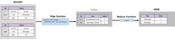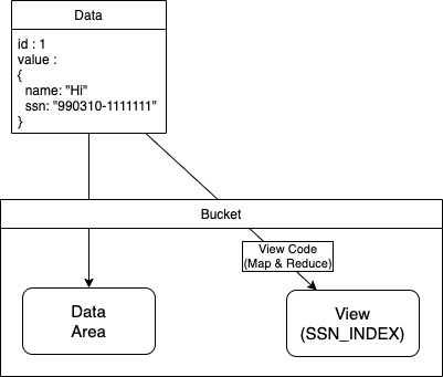 - 위 그림을 예로 들어보면, 저장하고자 하는 Data(Json Document) 안에 ssn(주민번호)가 있고, Bucket 에 90년생 이하만 저장하는 View 를 만든다고 가정하면 데이터가 저장될 때마다 생성된 뷰에 같이 저장된다.