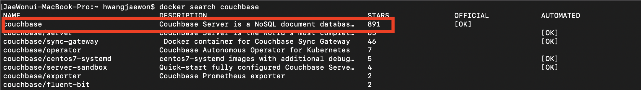 - Docker 가 설치되어 있다면 터미널에서 couchbase 를 검색한다.