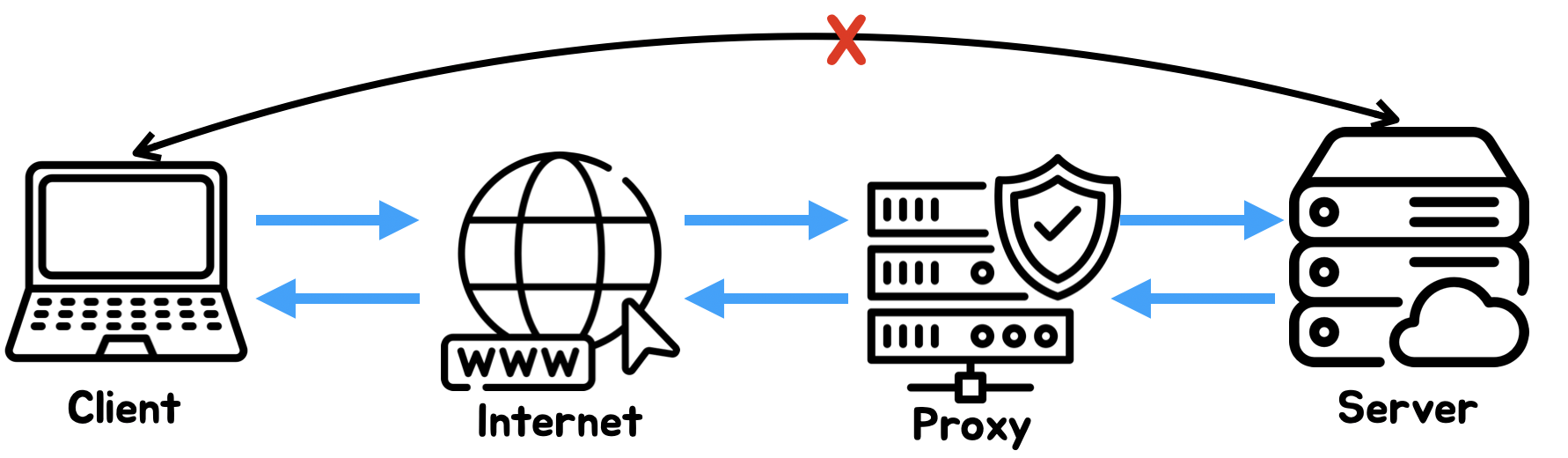 - 클라이언트(사용자)가 인터넷에 직접 접근하는 게 아니라 Forward Proxy 가 요청을 받고 인터넷에 연결하여 서버 응답을 클라이언트에게 전달(Forward) 해준다.