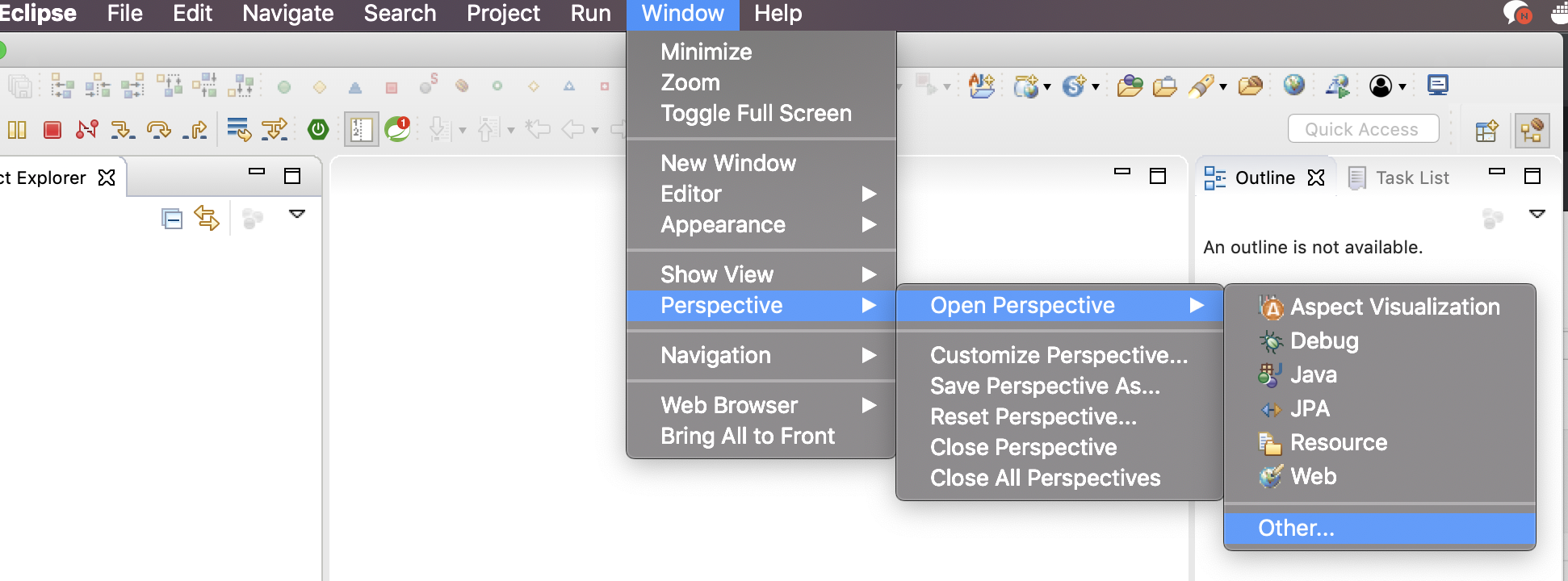 - 이클립스 -> 상단 메뉴 [Window] -> [perspective] -> [Open Perspective] -> [Other] 클릭