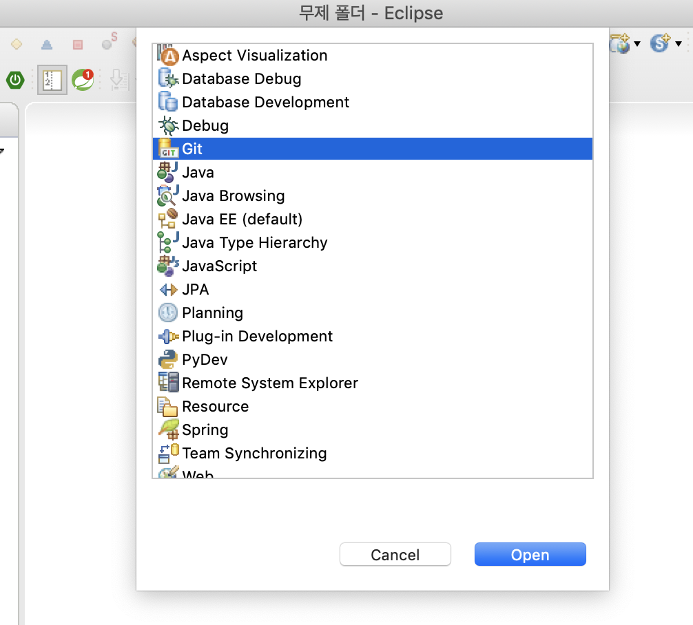 - [Open Perspective] 창 -> [Git] 선택 -> [Open] 클릭