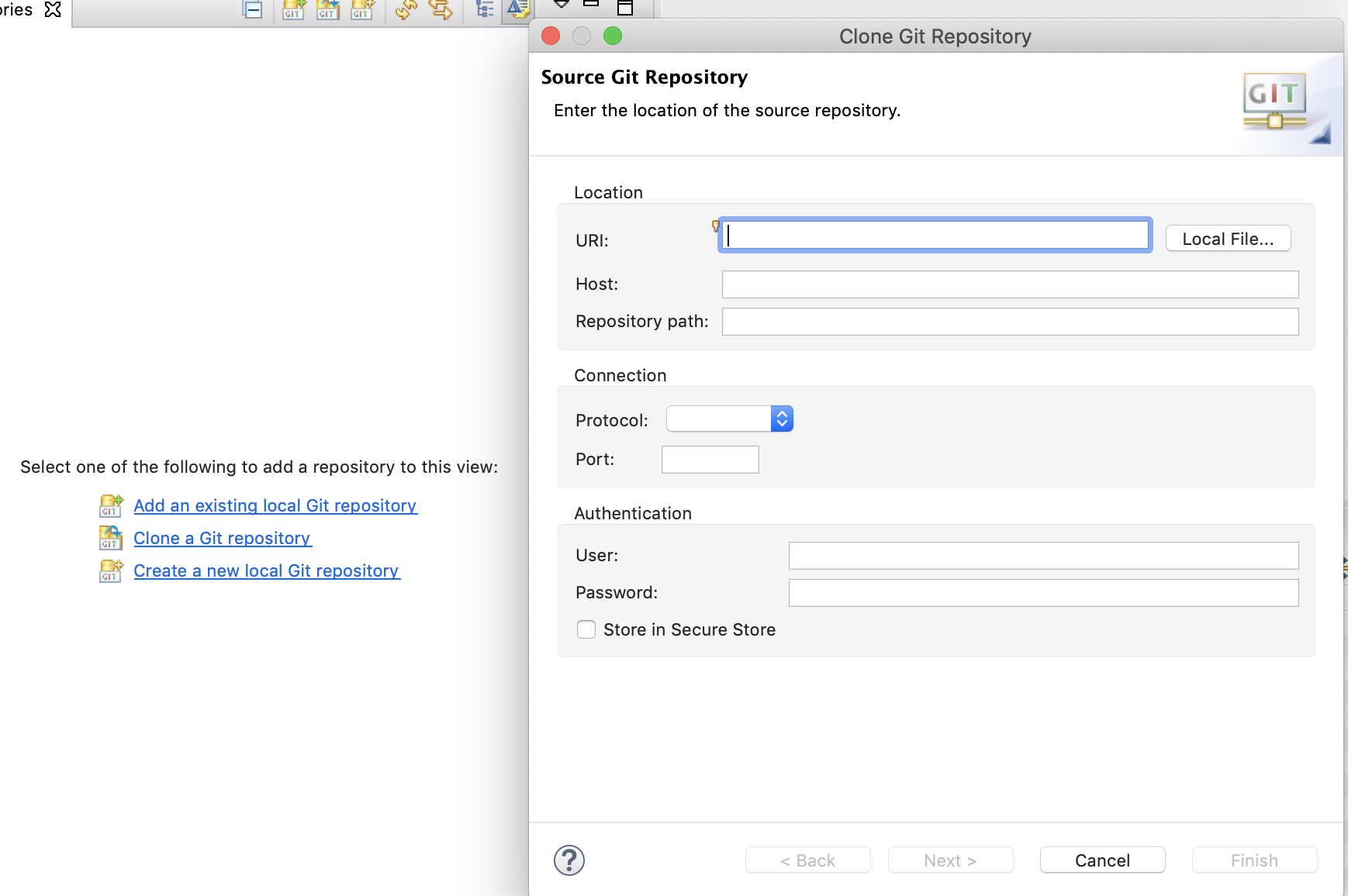 - Git Perspective로 변경 후 , 좌측의 [Git Repositories] -> [Clone a Git Repository] 클릭