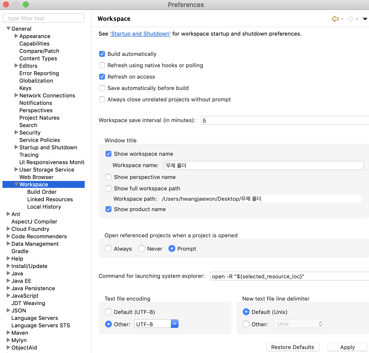 - [Preference] 창에서 [General] -> [Workspace] 선택 -> Text File Encoding에 Other 클릭 -> UTF-8 변경 후 저장