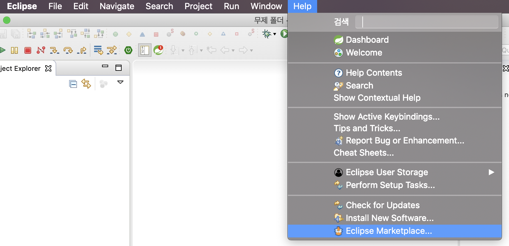 - 이클립스 -> 상단메뉴 [Help] -> [Eclipse Marketplace ....] 클릭