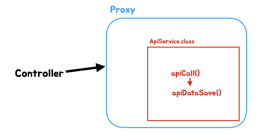 - 즉, 다시 한번 위에 말을 사용해 보면 Controller 에서 ApiService.class 의 apiCall() 메소드를 호출하고 해당 메소드에서 apiDataSave() 메소드를 호출하면 위 그림과 같이 프록시 내부에서 호출하게 됩니다.