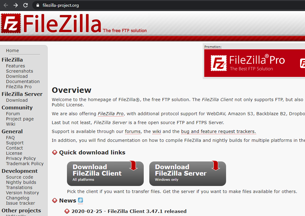 Overview Welcome to the homepage of FileZilla®, the free FTP solution. The FileZilla Client not only supports FTP, but also FTP over TLS (FTPS) and SFTP. It is open source software distributed free of charge under the terms of the GNU General Public Licens