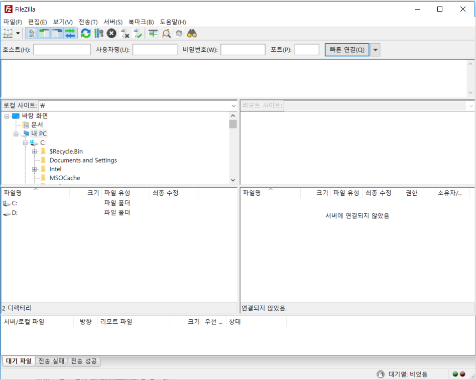 - 프로그램 중앙 좌측에는 사용자의 디렉토리(폴더) 구조가 우측에는 접속한 서버 디렉토리 구조가 나온다.